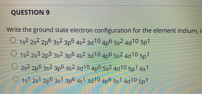 1s 2 2s 2 2p 6 3s 2 3p 6 3d 10 4s 2 4p 6 4d 10 5s 2 5p 1. How is vsepr used to classify molecules. The ground state electron configuration of ground state gaseous neutral indium is Kr.